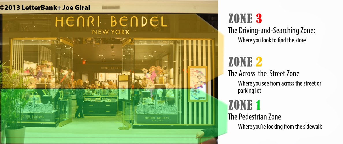 Do you know the times you're driving around looking for a store you haven't seen before? You're looking for a sign in Zone 3, the upper part of the store which is visible from a moving car. When you're walking in a parking lot of a strip mall, or walking across the street from the store you seek, you're looking at Zone 2 on the storefront. The Zone 3 is too high and Zone 1 is too low to see generally. Have you ever seen a person walking down the street and craning to look up to find the name of the store s/he's in front of? That's a person who has to look for a sign in a Zone 3 area for what should be a pedestrian-friendly Zone 1 sign placement.